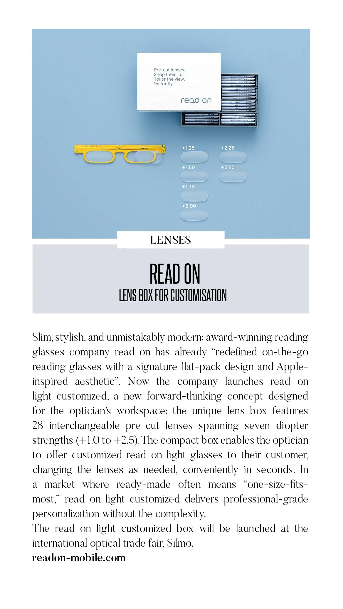 Slim, stylish, and unmistakably modern: award-winning reading glasses company read on has already “redefined on-the-go reading glasses with a signature flat-pack design and Apple-inspired aesthetic”. Now the company launches read on light customized, a new forward-thinking concept designed for the optician’s workspace: the unique lens box features 28 interchangeable pre-cut lenses spanning seven diopter strengths (+1.0 to +2.5). The compact box enables the optician to offer customized read on light glasses to their customer, changing the lenses as needed, conveniently in seconds. In a market where ready-made often means “one-size-fits-most,” read on light customized delivers professional-grade personalization without the complexity.